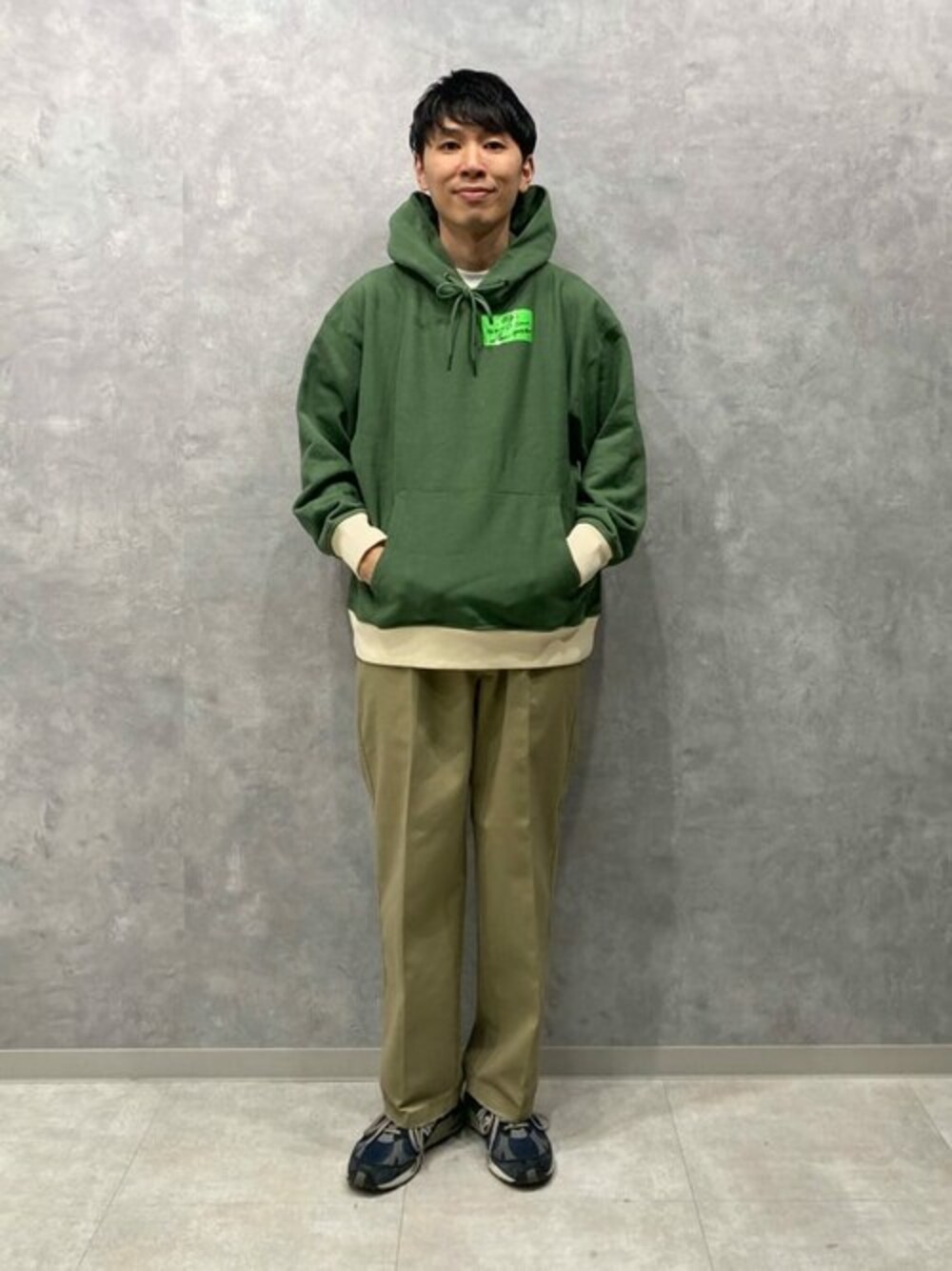 渕端=ふちはたです♫ 178cm/63kg グリーン×ベージュ×ネイビーの3色をベースにコーディネート! メインアイテムのパーカーはフェード感のある質感と、カレッジカラーのようなデザインはまるで古着のような1着です! デザインがシンプルだからこそサイズにこだわって選びましょう◎ *480g BRUSH オーバーサイズスウェットパーカーは他のコーディネート投稿でサイズ違いを着用してます、ぜひそちら合わせてサイズの参考にしてみて下さい♫