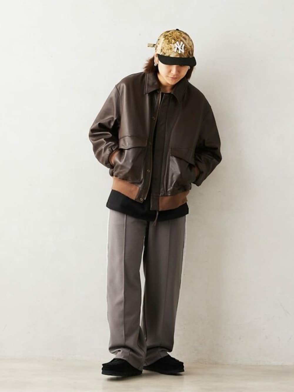 【SKOOKUM /別注 A-2 レザージャケット】 サイズ感: ゆとりあり 素材感: 柔らかいラムレザー 着心地: 程よい重量感で着心地抜群 【HARDIN KNITWEAR】ヘビーウェイト 長袖Tシャツ サイズ感: ゆとりあり 素材感: かなり厚めの生地感で肌触り○ 着心地: 着込んでも型崩れしないアイテム 【サイドライン ジャージートラックパンツ】 サイズ感: ゆとりあり 素材感: ストレッチ性のあるジャージ生地 着心地: 楽に履ける 【一言コメント】 初めての撮影で緊張している珍しい光景です^ ^ 全体的に暗めのコーディネートで組むことにより 2.3月も全然着用いただけるコーディネートです^ ^ 是非皆様もご参考になさってみてください!