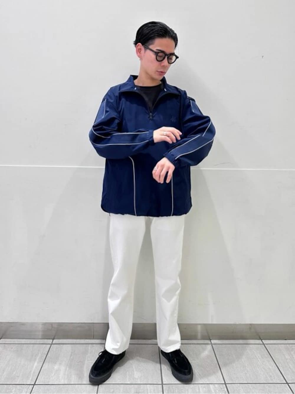 なんとあのKAPPAとのコラボ! 春らしく軽やかなシャカシャカナイロンが登場です! 今回はリーバイスのホワイトデニムで合わせて爽やかにコーディネートしました! ナイロンのパリッとした印象に、ホワイトのデニムを合わせることで大人らしく! モカシン型のスニーカーを持って来たのもポイントです!
