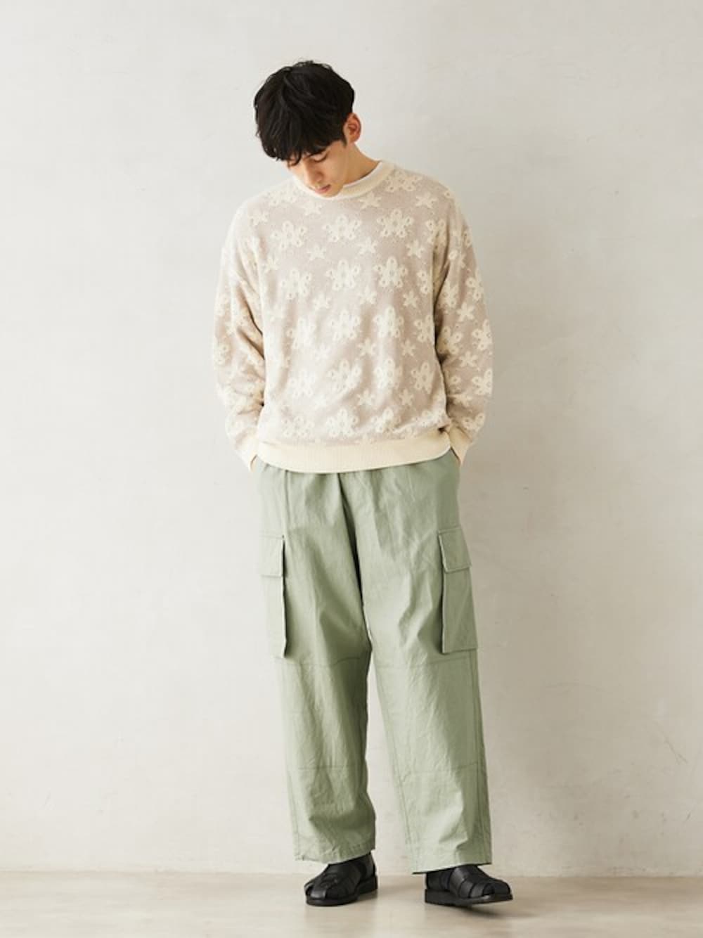 身長:179cm 体型:標準型 普段着用サイズ:L 年齢:20代 前回に引き続き大きな柄を大胆にあしらった総柄ジャガードクルーネックニットが今シーズンも登場! 表面感のある花柄が春らしくて今の時期にピッタリなニット。 花柄が可愛くみえてしまうのでカーゴパンツで男らしさをプラスしました。 《ニット》 着用サイズ:L 着用サイズ感:全体的にゆったり目なサイズ感です。