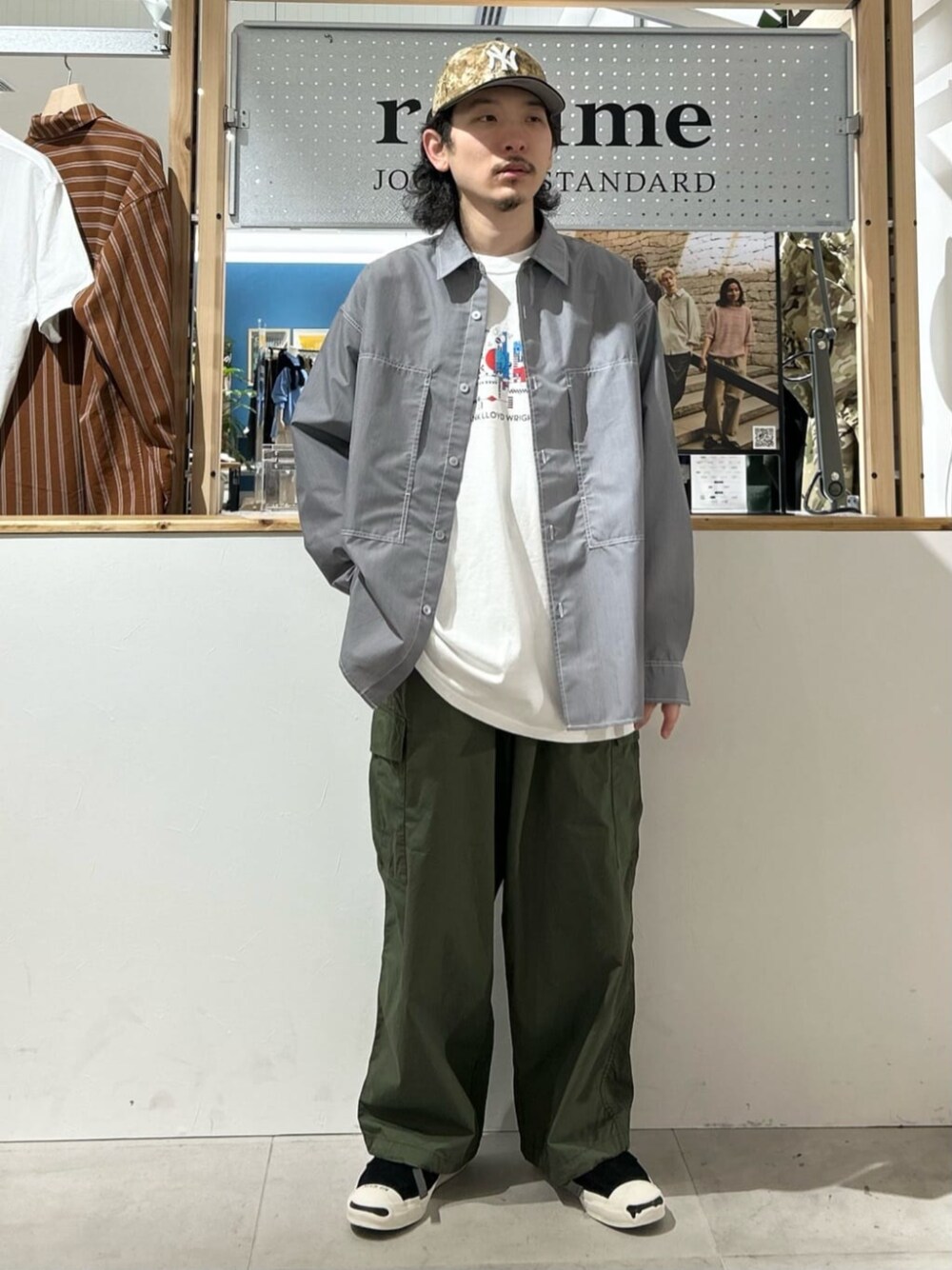 大きな両胸ポケットを配置し、サイドからアクセスしやすいデザインは、かつてミリタリーのユーティリティシャツからのデザインソース。 ずどんと太いミリタリーらしいワイドシルエットで、そのままワイドストレートとして履くするのはもちろん、裾の紐を絞ることでトレンドのパラシュートパンツのように着用することもできます。