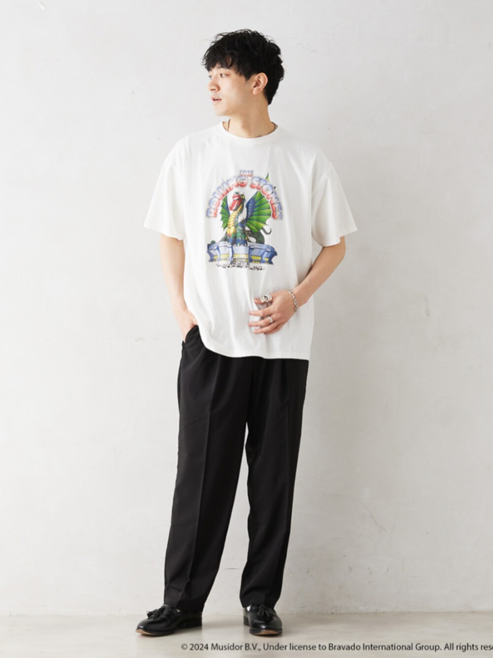 身長:176cm 体型:標準型 普段着用サイズ:L 年齢:30代 実際に行われたザ ローリングストーンズのツアーで販売されていたグラフィックを再現したツアーT。 ロックTらしいブラックよりも、普段使いしやすいホワイトTは普段のスタイリングにも取り入れやすくておすすめ。 今回はブラックのスラックスと合わせてみました。 《Tシャツ》 着用サイズ:L 着用サイズ感:ゆったりしたリラックス感のあるサイズ 《パンツ》 着用サイズ:L 着用サイズ感: ややゆったりとしたサイズ感です。