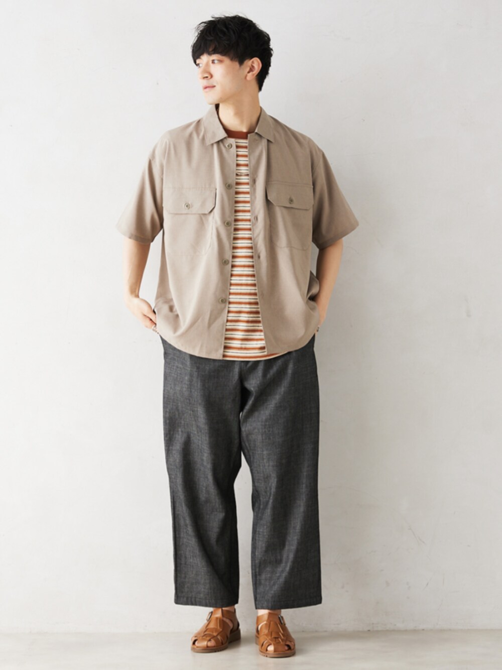 身長:176cm 体型:標準型 普段着用サイズ:L 年齢:30代 リネンの素材感を表現したポリエステル素材"テックリネン"を使ったCPOシャツが今年も登場! 前を開けてインナーを見せることで夏のシンプルなスタイリングの幅も広がります。 シャツがシンプルなので、インナーはボーダーで遊びを効かせました。 《シャツ》 着用サイズ:L 着用サイズ感:ややゆとりがあるサイズ感です。 《Tシャツ》 着用サイズ:L 着用サイズ感:オーバーサイズでゆったりとしています。 《パンツ》 着用サイズ:L 着用サイズ感:セミワイドなシルエットです。