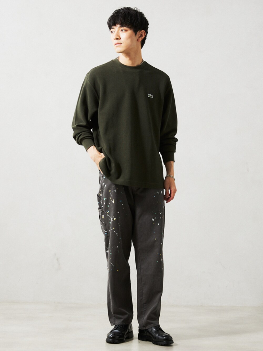 身長:176cm 体型:標準型 普段着用サイズ:L 年齢:30代 ヘビーカノコ素材で仕上げた着心地抜群のLACOSTE別注ロンTが昨シーズンに続いて今年も登場! 秋らしいカーキのロンTをブラックデニムでシックに着こなしました。 前回からリサイズを行い、前回よりも若干身幅・肩幅を小さくしているので、ジャストサイズで程良くラフに着こなせます。 《ロンT》 着用サイズ:4 着用サイズ感:オーバーサイズで、ボックスシルエットに近いサイズ感です。 《デニムパンツ》 着用サイズ:L 着用サイズ感:全体的にワイド、丈がやや長いサイズ感です。