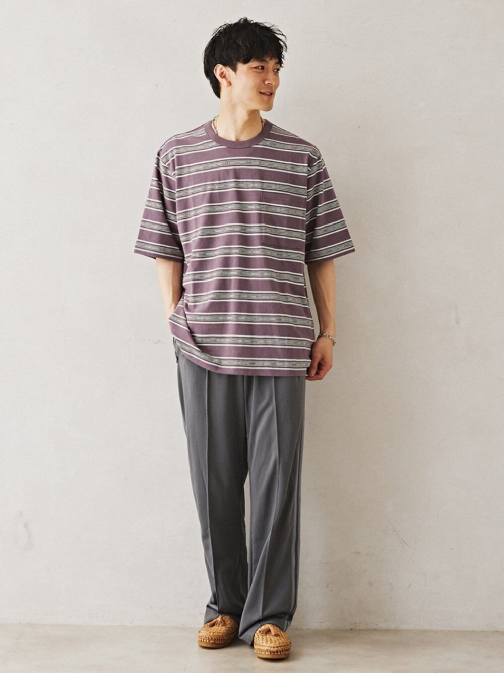 身長:176cm 体型:標準型 普段着用サイズ:L 年齢:30代 relumeだけの、存在感のあるジャガードボーダーT。 よく見るとボーダーにネイティブ柄が隠れていて、オリジナリティー溢れるアイテムです。 Tシャツのくすみカラーによく合う、グレーのパンツと合わせたニュアンスのあるスタイルにしてみました。 《Tシャツ》 着用サイズ:L 着用サイズ感:ゆったりしたリラックス感あるサイズ。
