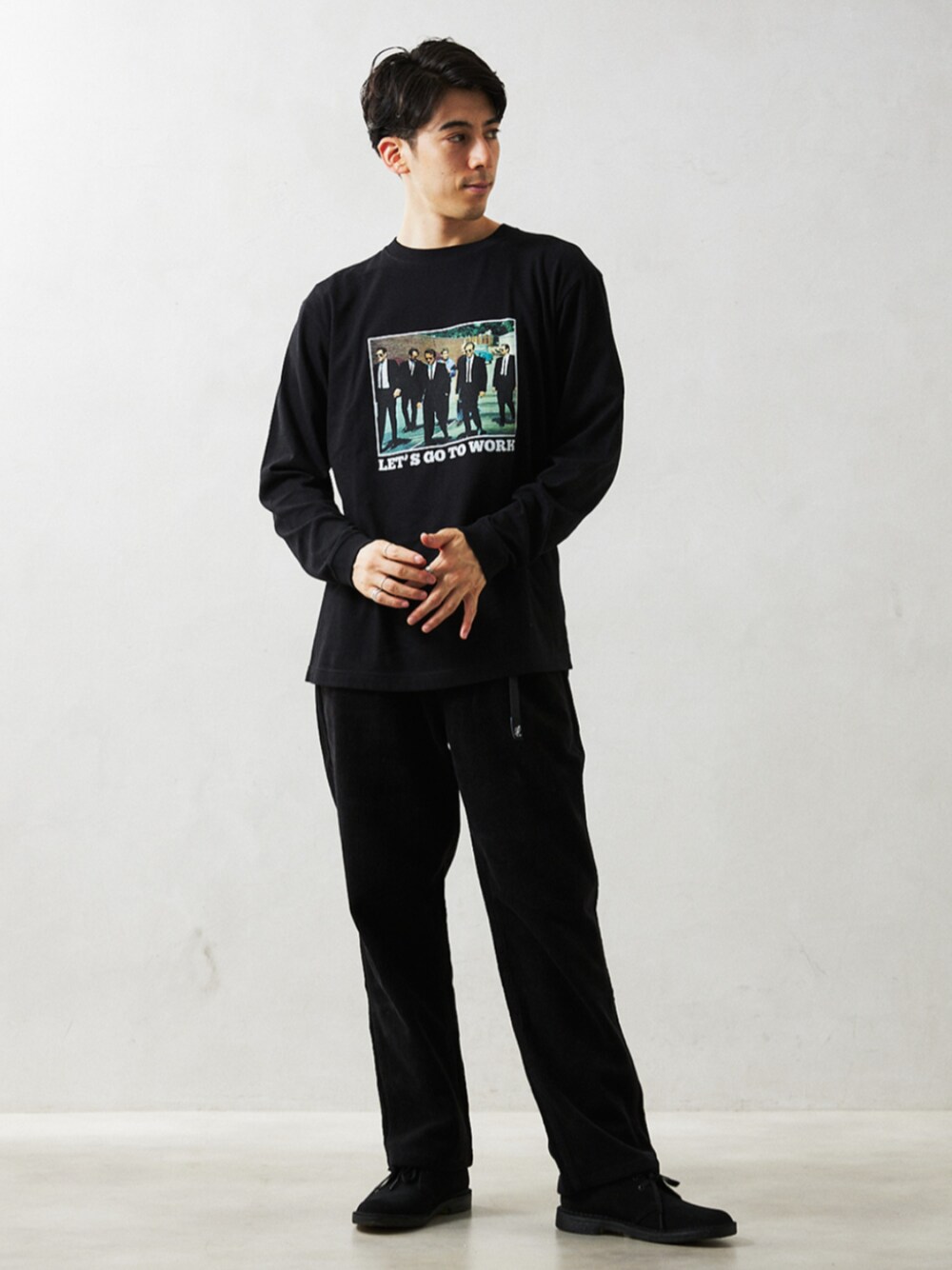 身長:179cm 体型:標準型 普段着用サイズ:L 年齢:20代 映画『RESERVOIR DOGS』との別注デザイン、ムービーTシャツが登場! 1991年に公開の映画『RESERVOIR DOGS(レザボア・ドッグス)』は、公開から30年以上経った今でもデジタルリマスター版の公開など根強い人気を誇る名作映画。 映画の世界観をそのままに、オールブラックでスタイリッシュに着こなしてみました。 《ロンT》 着用サイズ:L 着用サイズ感:ややゆったりとしたサイズ感です。