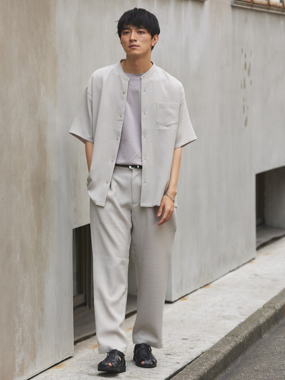 身長:176cm 体型:標準型 普段着用サイズ:L 年齢:30代 落ち感のあるrelume定番バンドカラーのキレイめ半袖シャツが登場! 同素材のパンツとセットアップで着用しました。 夏らしいナチュラルカラーが見た目も涼しく、吸収速乾の素材で着心地も◎ 全体がぼんやりしないよう、足元はブラックでメリハリをつけました。 《シャツ》 着用サイズ:L 着用サイズ感:ややゆったりとしたサイズ感です。 《パンツ》 着用サイズ:L 着用サイズ感:テーパードシルエットなので、太もも部分はゆったりとしています。