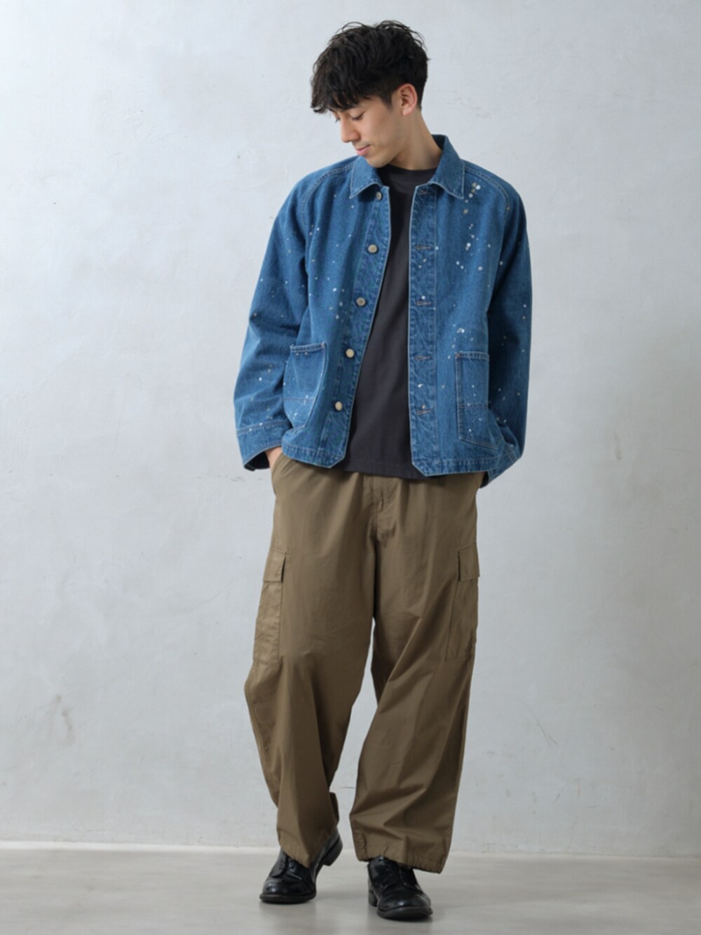 身長:179cm 体型:標準型 普段着用サイズ:L 年齢:20代 ヴィンテージ市場でも珍しい、衿付きのエンジニアジャケットにウォッシュ加工とタンブラー乾燥を施し、ペンキで仕上げた加工感が魅力のデニムジャケット。 デニム×カーキで秋らしいスタイリングにしました。 ラグランスリーブなので動きやすく、ややオーバーサイズなサイジングでリラックスして着用できます。 《ジャケット》 着用サイズ:L 着用サイズ感:ゆったりしたサイズ感です。 《カーゴパンツ》 着用サイズ:L 着用サイズ感:ゆとりのあるワイドシルエットです。