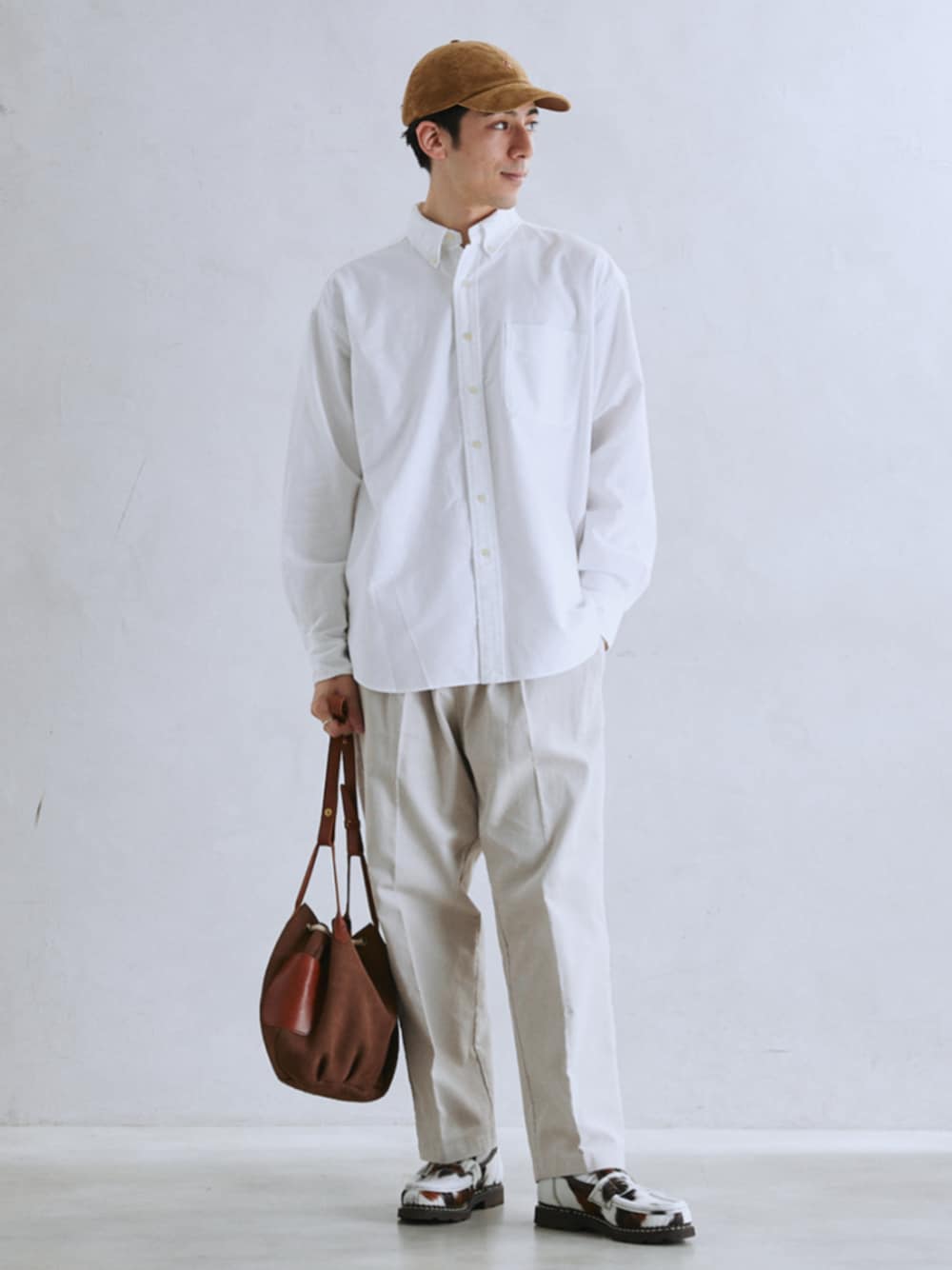 身長:179cm 体型:標準型 普段着用サイズ:L 年齢:20代 白シャツにグレーのパンツでクリーンな印象にしました。 ブラウンのキャップやバッグで秋らしさをプラスしました。 《シャツ》 着用サイズ:L 着用サイズ感:身幅がゆったりめのサイズ感です。 《パンツ》 着用サイズ:L 着用サイズ感:ワイドなテーパードシルエットです。