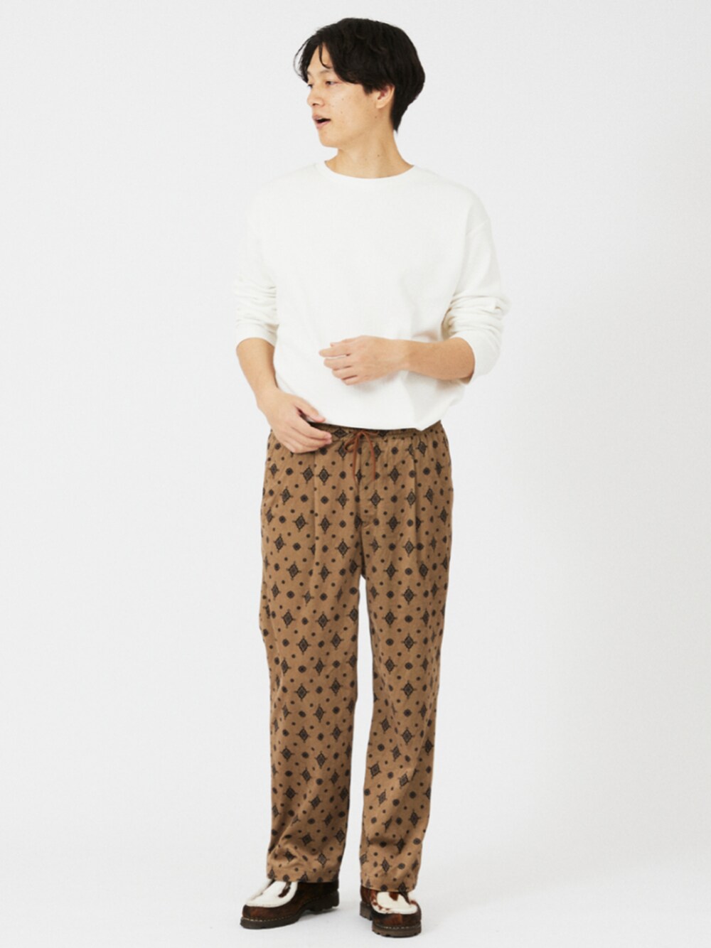 身長:182cm 体型:標準型 普段着用サイズ:L 年齢:30代 南仏の風を感じる、ヴィンテージフラワー柄イージーパンツ。 ポリエステルのベロア調起毛をかけた柔らかいツイル素材で秋冬らしい着こなしにもピッタリ。 ウエストはイージー仕様でストレスなく着用できます。 《パンツ》 着用サイズ:L 着用サイズ感:ワイドテーパードシルエット。