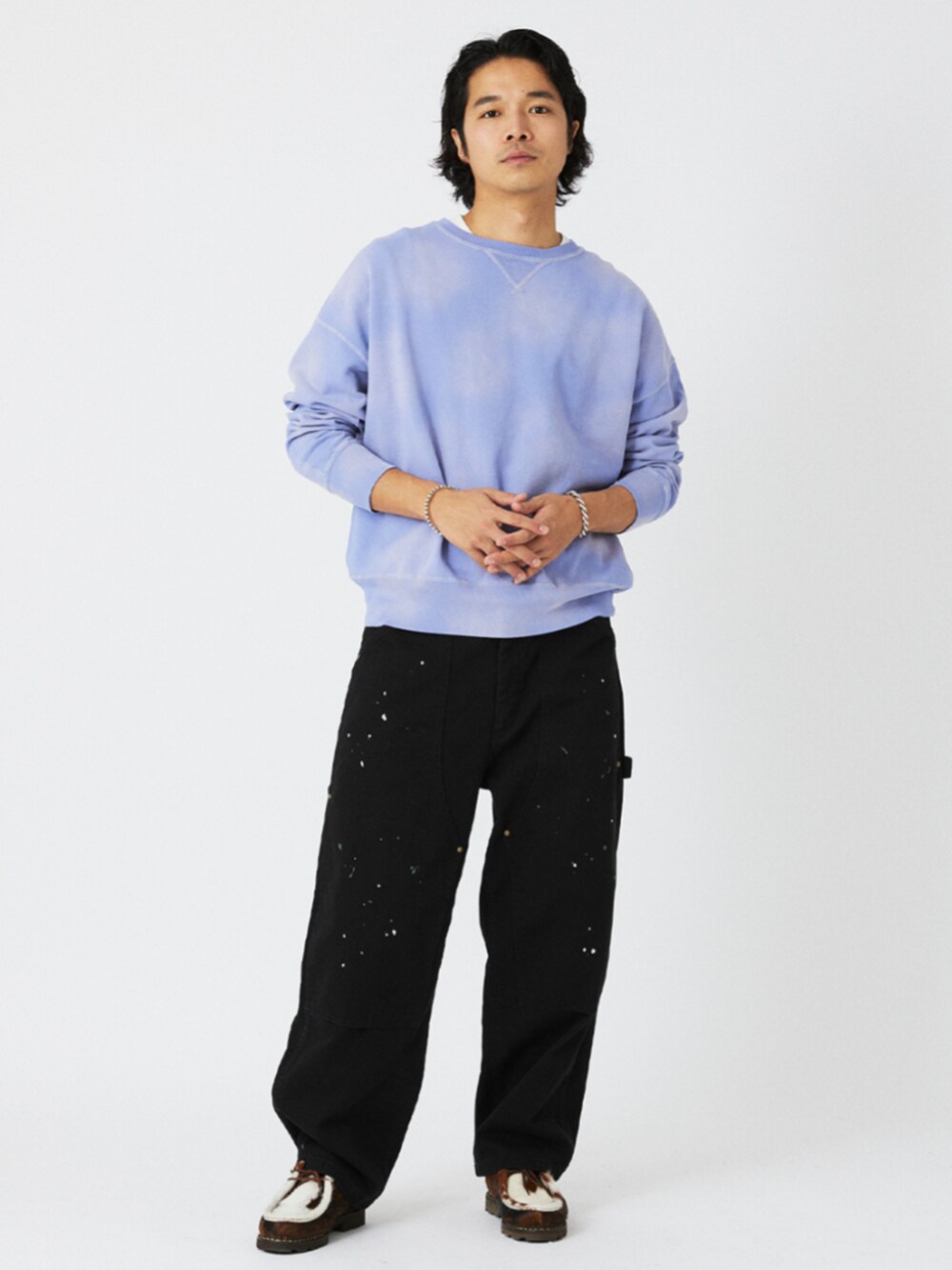 身長:181cm 体型:標準型 普段着用サイズ:L 年齢:20代 ムラ染め加工を施した程よい肉厚のコットン素材のスウェット。 存在感がありながらも、普段のスタイリングにも取り入れやすいアイテムです。 《スウェット》 着用サイズ:L 着用サイズ感:ほどよくゆとりのあるサイズ。 《パンツ》 着用サイズ:L 着用サイズ感:全体的にワイドなシルエットです。