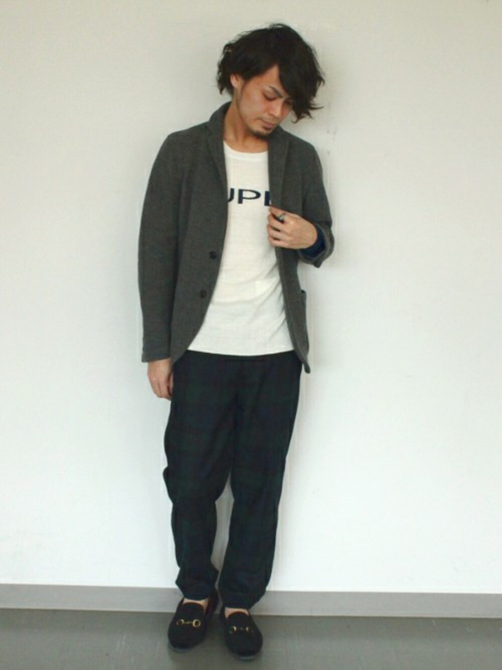 ivory courtが得意とする休日のジャケットスタイルです。 ジャケットのインナーをニットにすることで、硬すぎないジャケットスタイルに。 ボトムスのフラノのイージーパンツは今季一押しです。