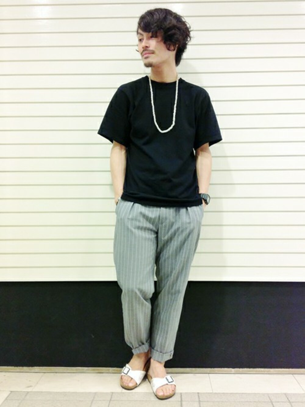 トレンドのブラックカラーのTシャツにスラックスを合わせて カジュアルになり過ぎない様に意識しました。