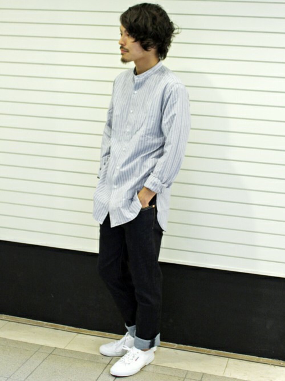 JOURNAL STANDARD relume(JOURNAL STANDARD relume 本社)のシャツ/ブラウス「ブルーストライプ バンドカラーシャツ◆」を使ったコーディネート