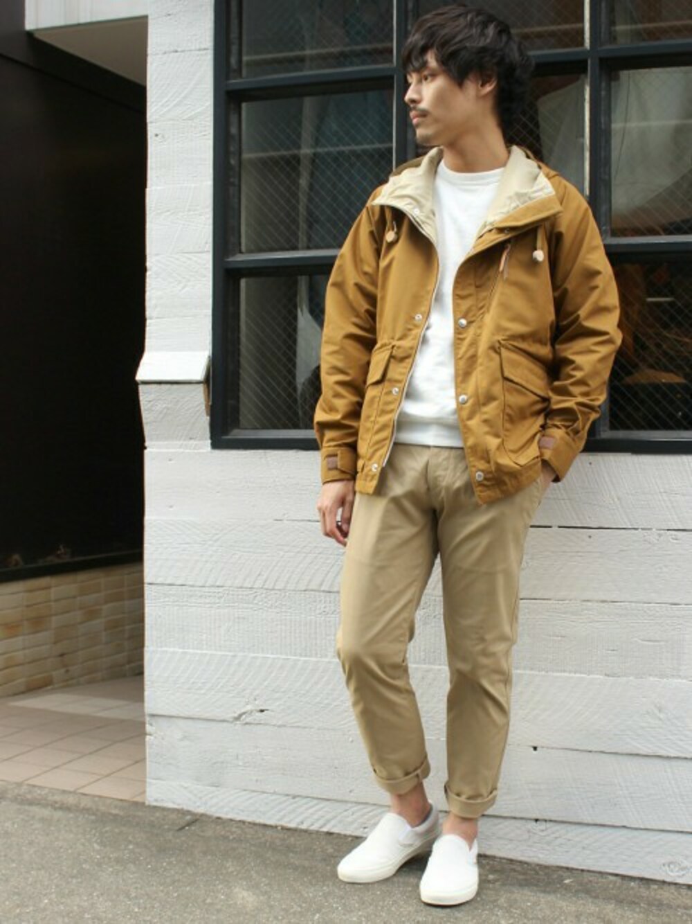 ベージュ系カラーを基調にトレンドのアウトドアスタイルを演出。 足元はロールアップしてスリッポンを合わせる事で軽さが出ます。
