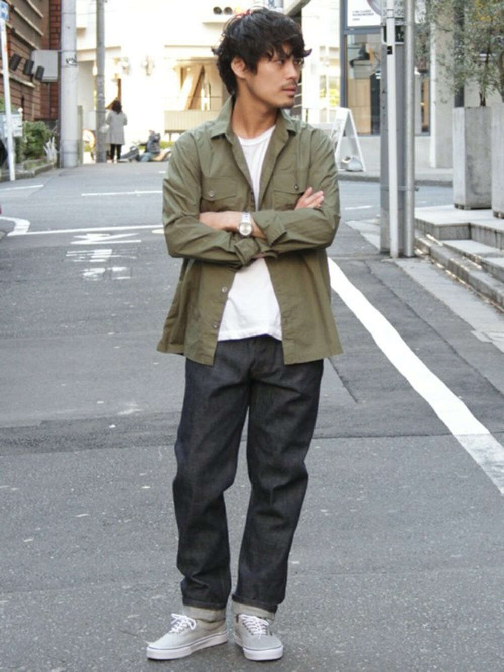 継続してトレンドのミリタリーシャツは無地Tシャツやデニムと合わせてシンプルにスタイリング。