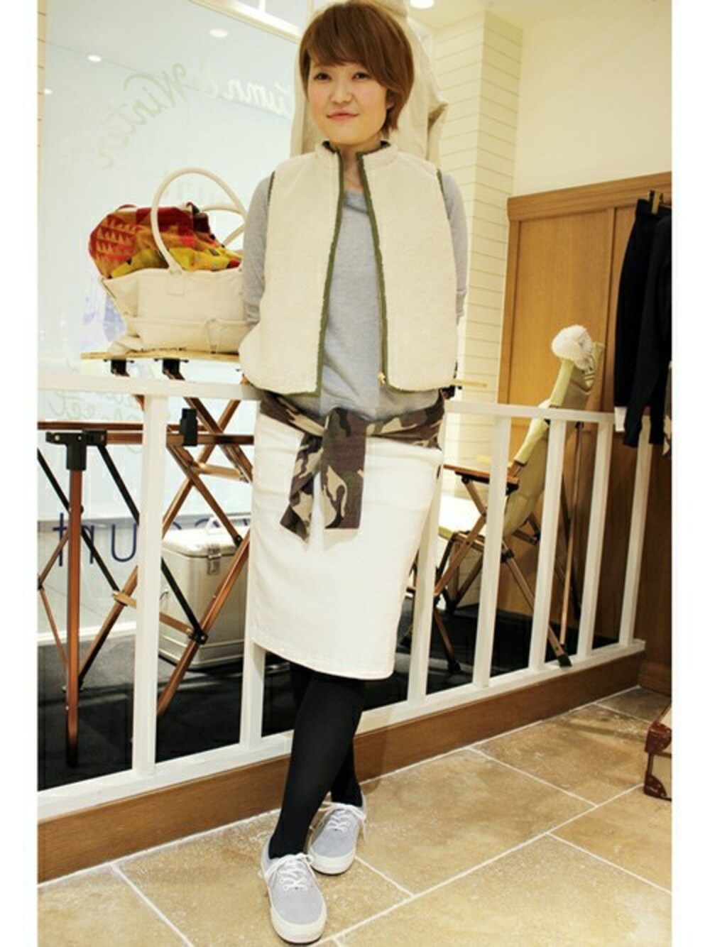 スポーティーな印象のボアベストを主役に。タイトスカートで揃えてすっきりした印象にまとめました。