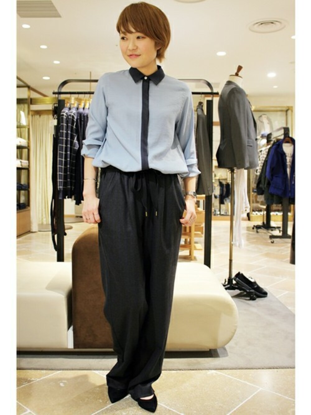 今気になるのはシャツをすっきりとインしたマニッシュスタイル。 ボリュームのあるシルエットが旬なパンツでコーディネート。
