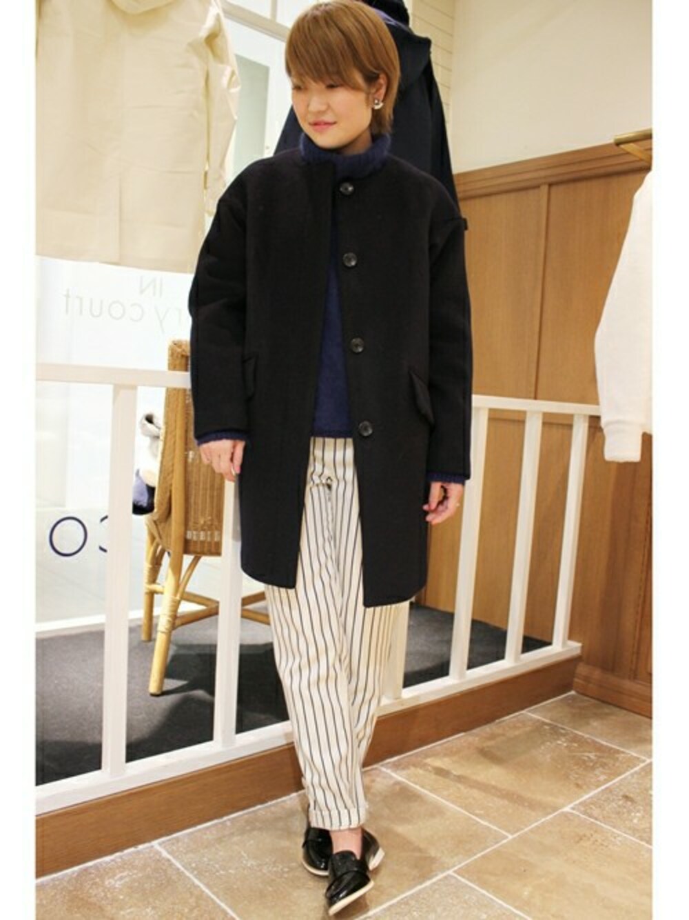シンプルなノーカラーコートは、今シーズンマストアイテムのハイネックニットにも相性◎ ストライプのパンツでマニッシュに