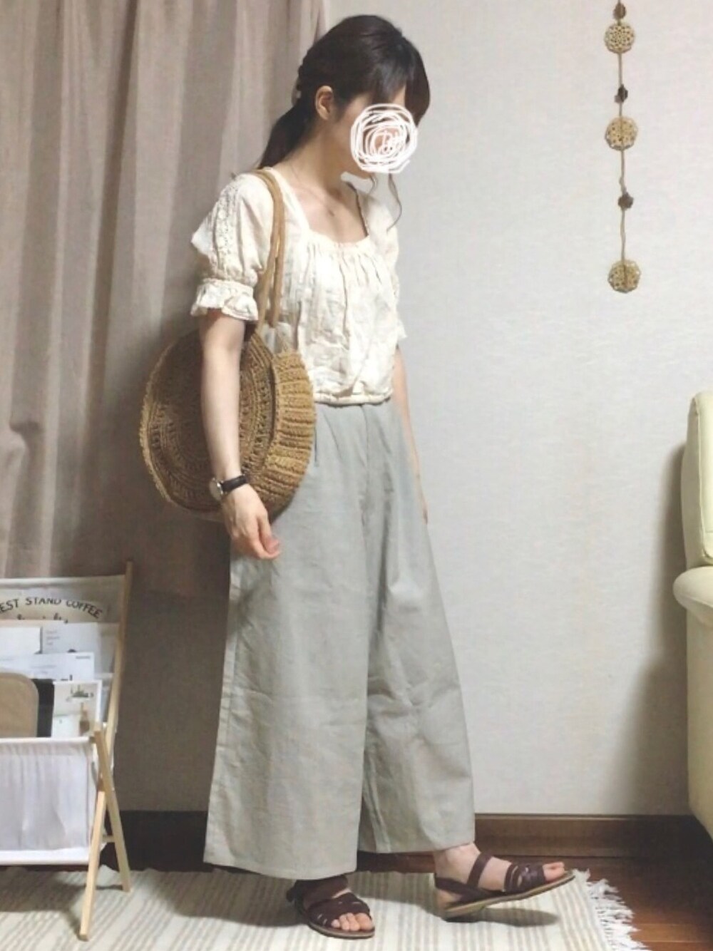 crispのキナリ色のブラウスはレースやギャザーで甘〜いデザインだけど、スクエアネック×ショート丈なので、ワイドパンツと合わせてすこし大人っぽく🌼 ワイドパンツ、私にはちょっと長めなので、ウエスト折り返して履いています👖 シルエットが変わっちゃうのでちょっぴり悲しい😢