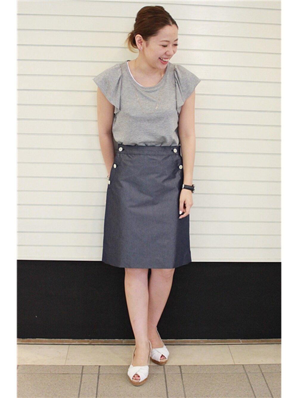 シャンブレーのキレイな素材のスカートに裏毛のトップスでキレイ目にあわせました!
