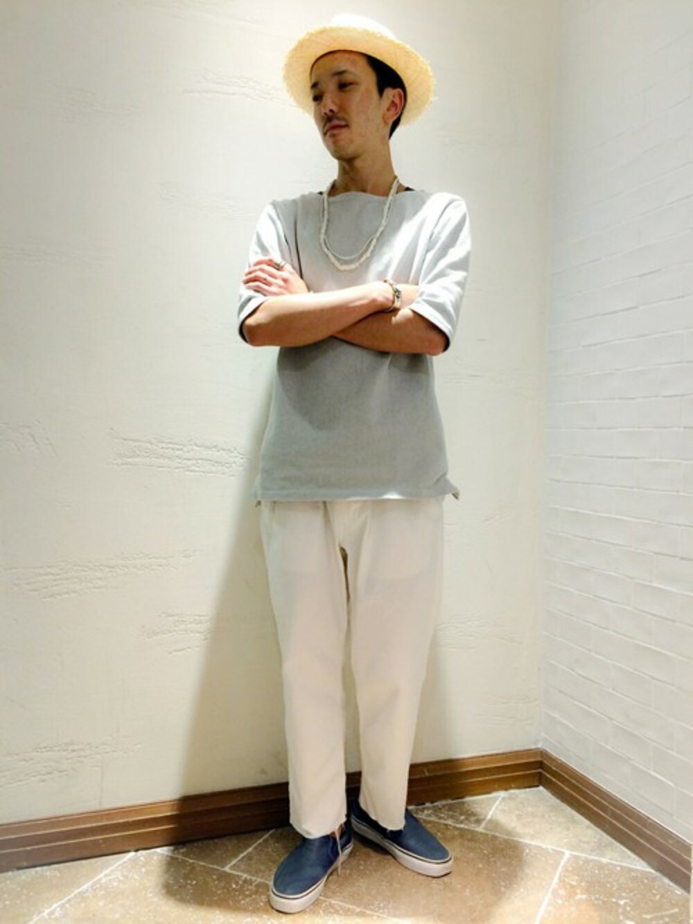 キレイめなデザインの無地プルオーバーをホワイトデニムと合わせて、 クリーンな印象にしました。