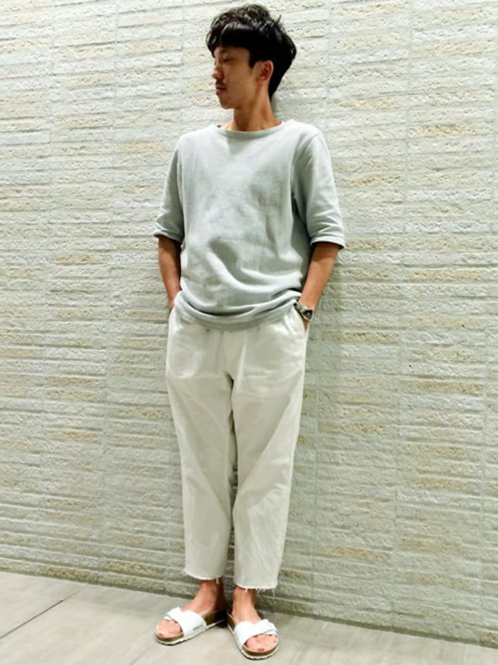 キレイめでクリーンな印象の無地プルオーバーを ホワイトデニム、ホワイトサンダルで統一した清潔感のあるスタイリングです。