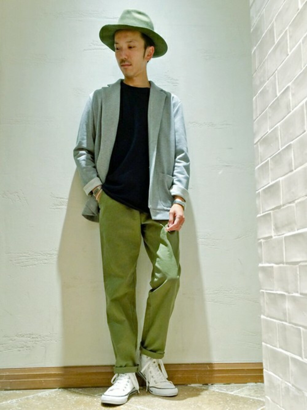 伸縮性に富んだ鹿の子素材を使用した、ジャケットカーディガン。 トレンド色のカーキのギャバパンツと合わせた、初秋カジュアルスタイルです。