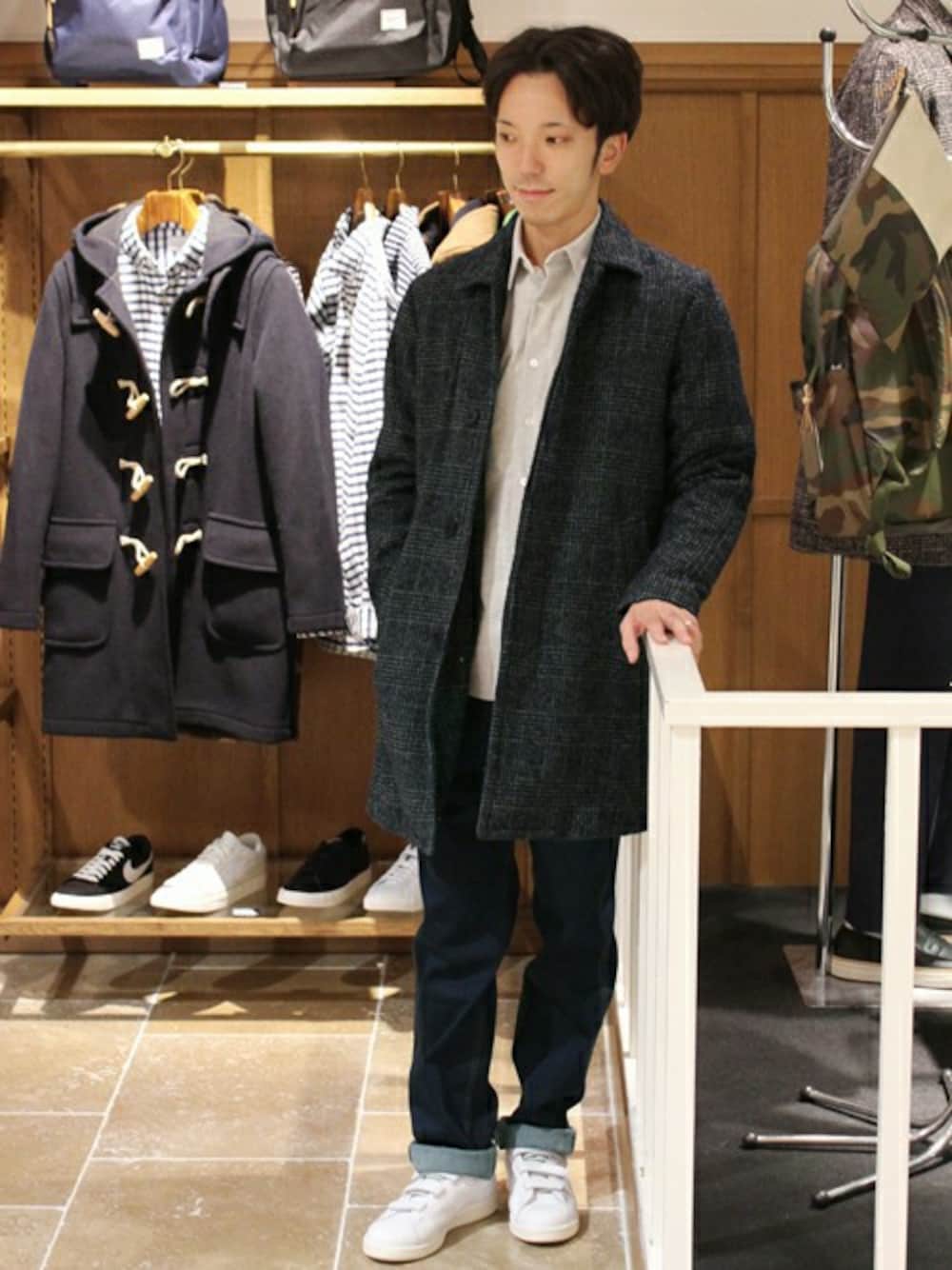 キレイめな印象のステンカラーコートはデニムとスニーカーで肩肘張らないコーディネートに。 もちろんスラックスやウールパンツとも相性よく合わせて頂けます。