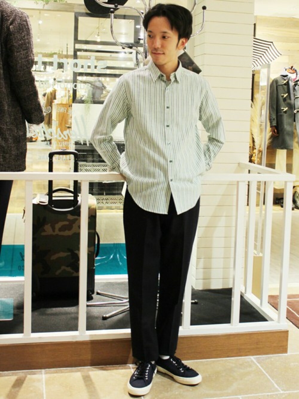 ソフトな印象のあるストライプ柄のシャツに、ボトムスと足元はネイビーで統一することでメリハリのあるシャツスタイルです。 ボトムスはイージーパンツですが、フラノ素材なのでカジュアル過ぎない印象を与えてくれます。
