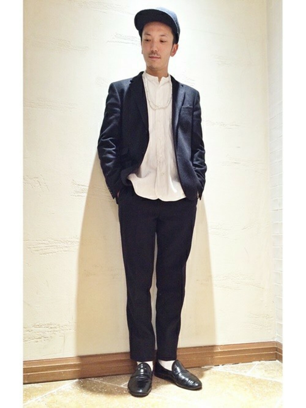 フラノ素材のセットアップをバンドカラーシャツやキャップでカジュアルダウン致しました。
