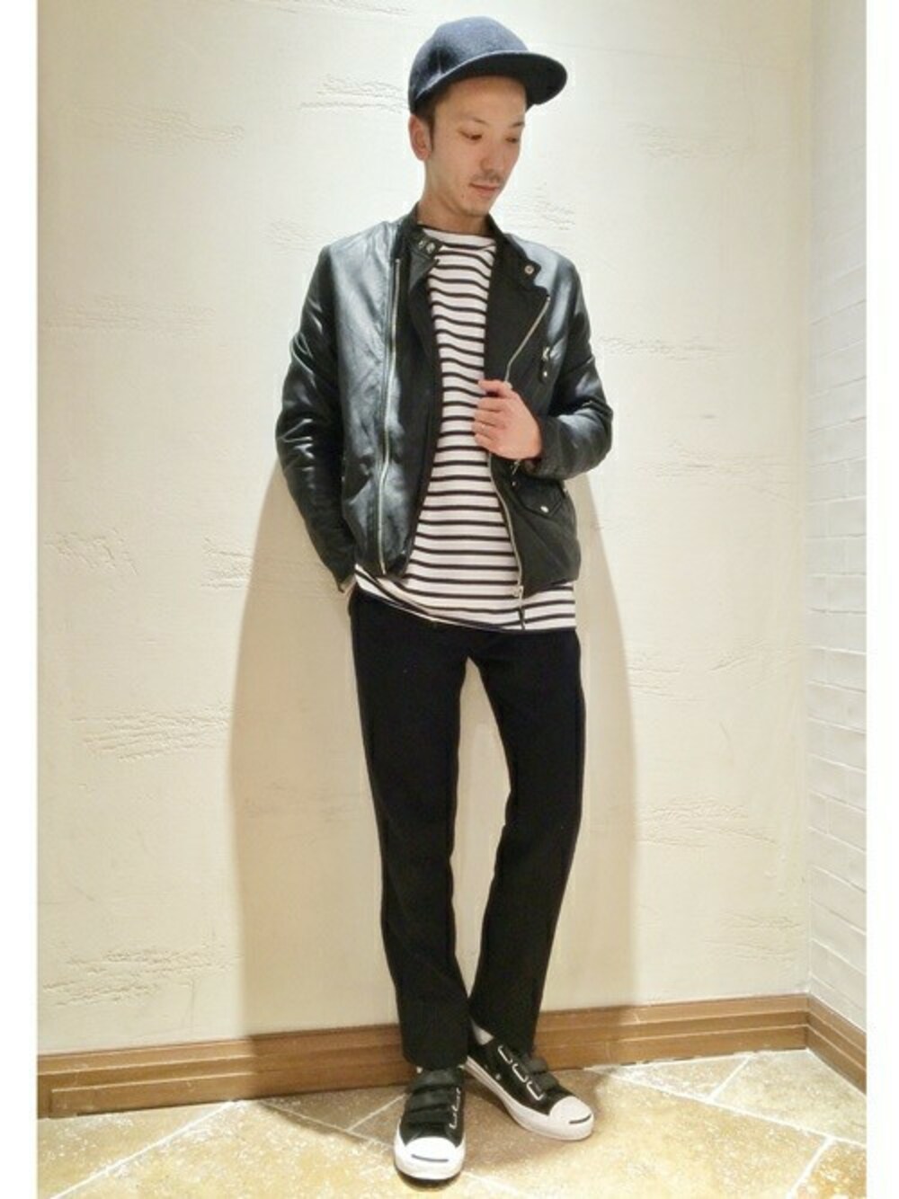 柔らかいヤギ革を使用したAWESOMEレザーのダブルライダースブルゾン。 春先の着こなし提案として、ボーダーカットソーをインし、軽さを出しました。