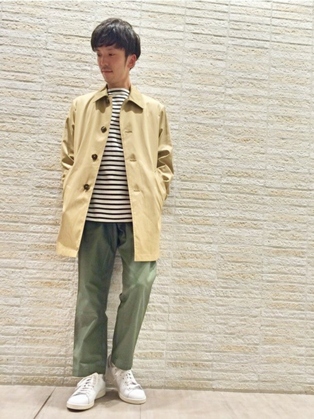 柔らかいベージュ色のステンカラーコートを羽織り、インナーに白/ネイビーを差し込みました。 足元をホワイトでまとめ、クリーンな印象に仕上げました。