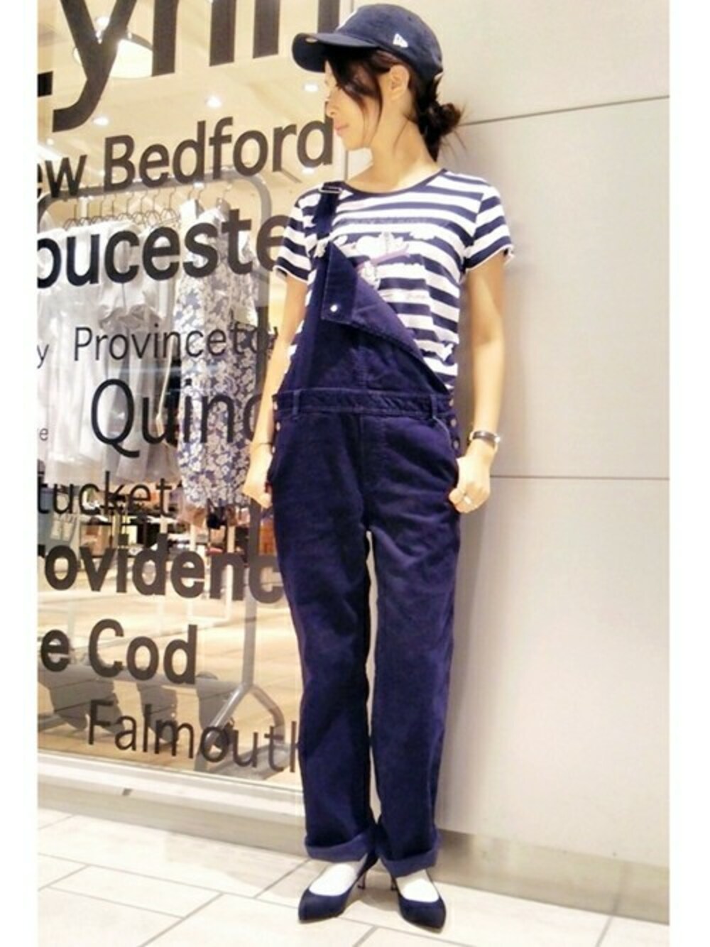 秋の匂いを感じさせる、コール素材のサロペットをボーダーTでカジュアルに着こなします。 足元はポインテッドトウのパンプスで女性らしさも忘れずに。