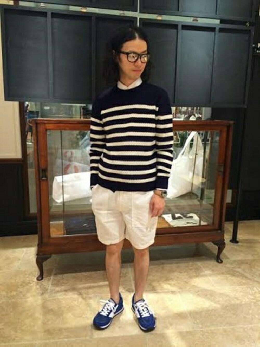 7Gのニットをショーツと合わせてスタイリング!! 通気性が良く、心地よい休日のマリンスタイルイメージです。 スポーツの後などにサッと着て町に繰り出して下さい!!