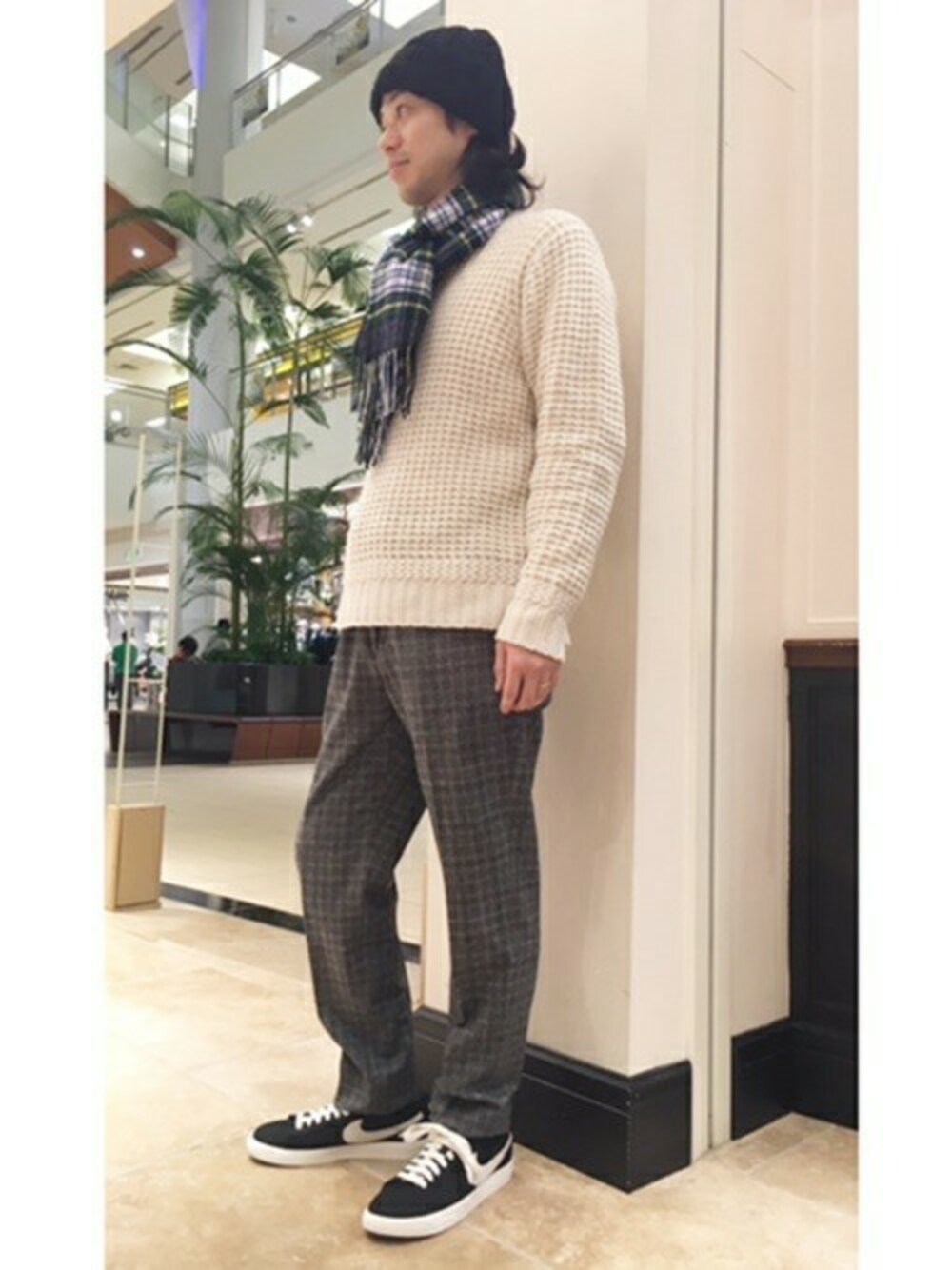 ワッフル編みのザックリ編みのニットをややルーズに。 ボトムスをウールのテーパードタイプのパンツでやや上品でキレイな感じを意識して合わせました。