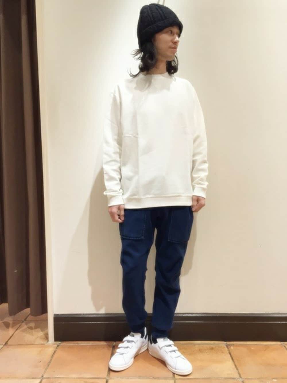 今期トレンドのビッグシルエットタイプのニット。 同じく今春のトレンドアイテムである、インディゴのタイトシルエットのスウェットパンツで 爽やか・スポーティーに。