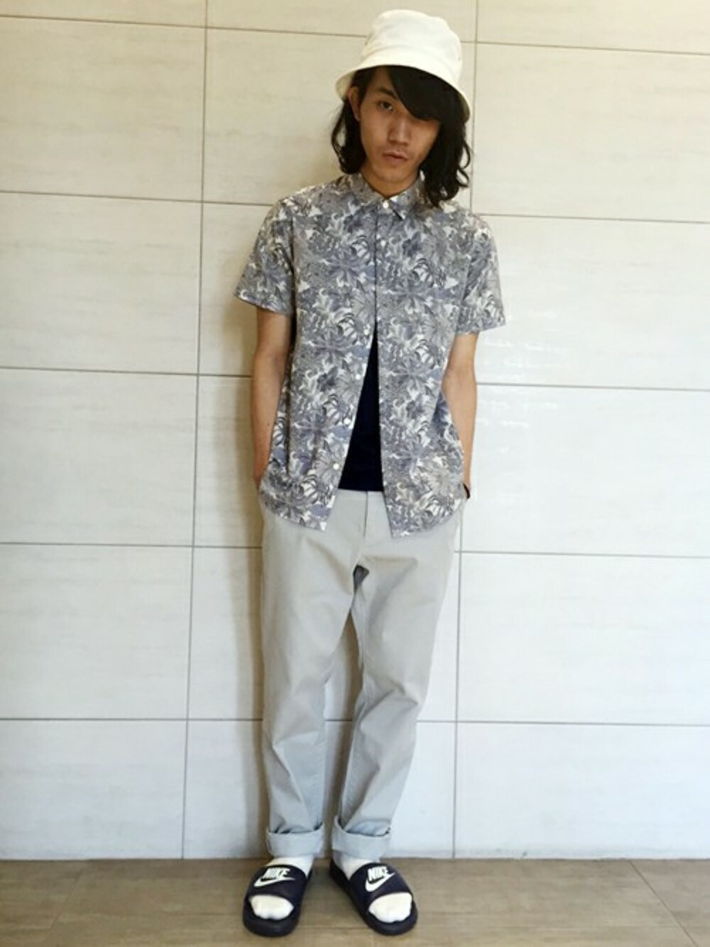 リゾート感漂うLIBERTYプリントシャツをメインに 足元にNIKEベナッシを合わせた肩肘張らないリラックススタイル。