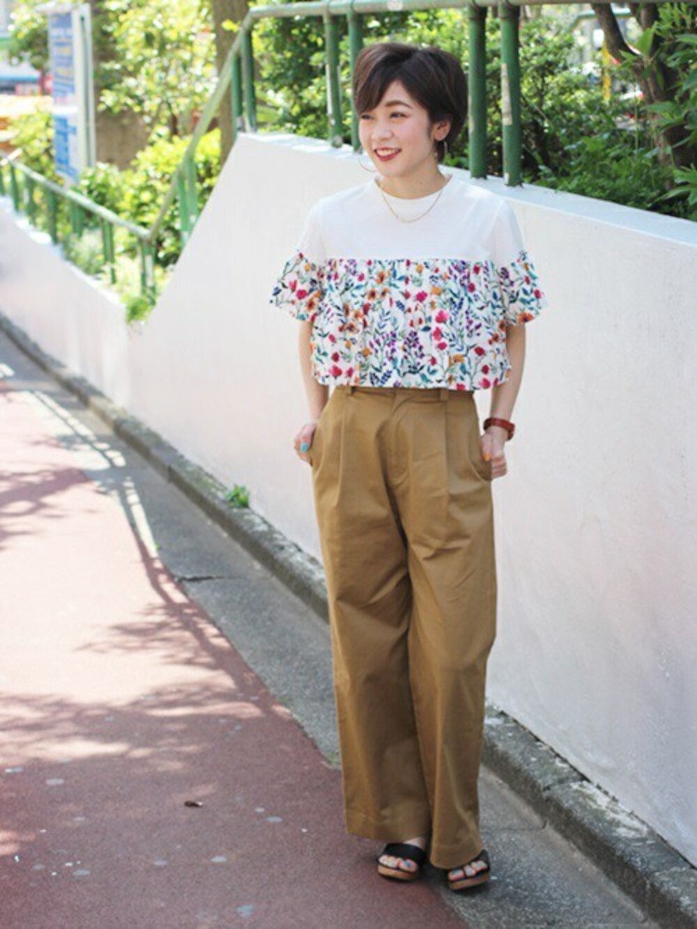 トレンドの花柄Tシャツをかっこよく☆ ワイドパンツで大人にあわせました。