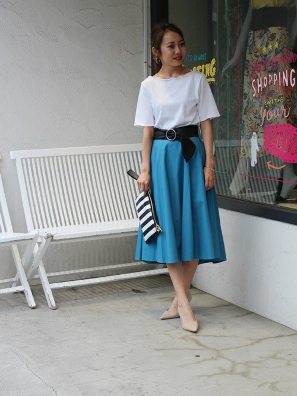 ブルー×ホワイトのさわやかコーディネート! 夏らしいスタイリングにウエストベルトがアクセント! 見ていただきありがとうございます!