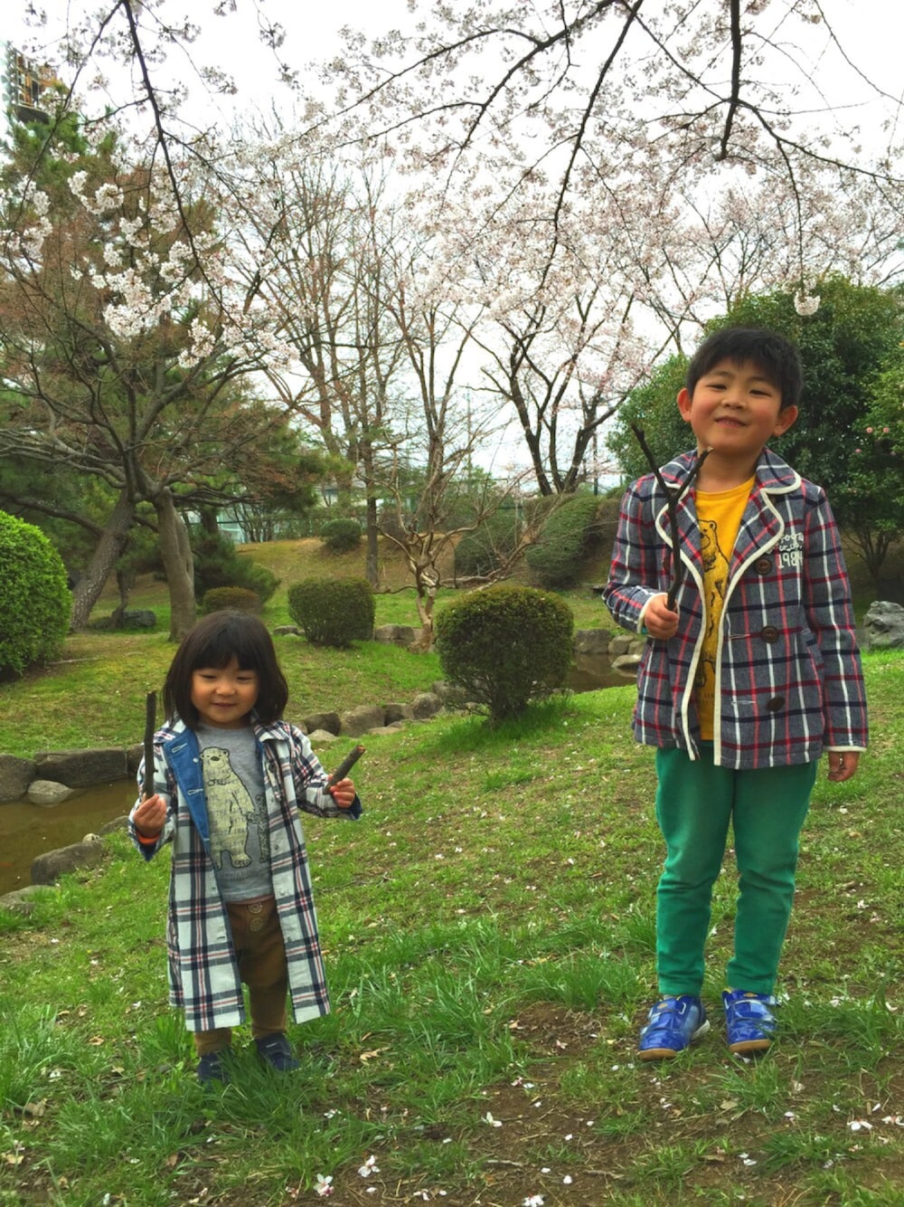 お花見🌸に出ました。 あいにくの曇り空。。。 コーデの小物は、拾った枯れ木。 この後、チャンバラ対決。 何しに来たんだーーーー😱
