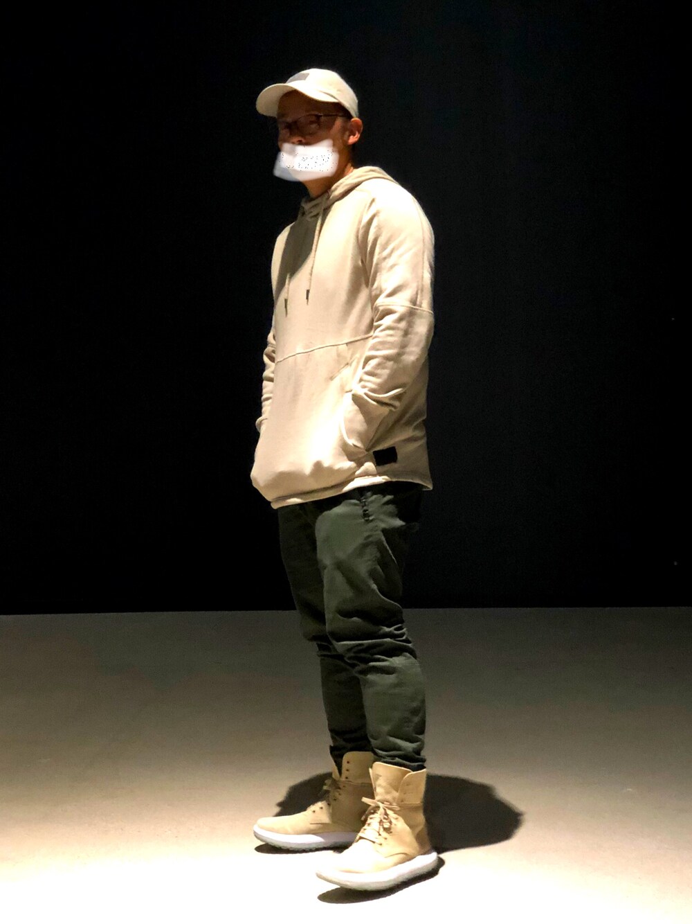 ベージュのキャップ、フーディ、ブーツを合わせました。 パンツはカラーの相性がいいカーキで、全体をアースカラーでまとめてみた。