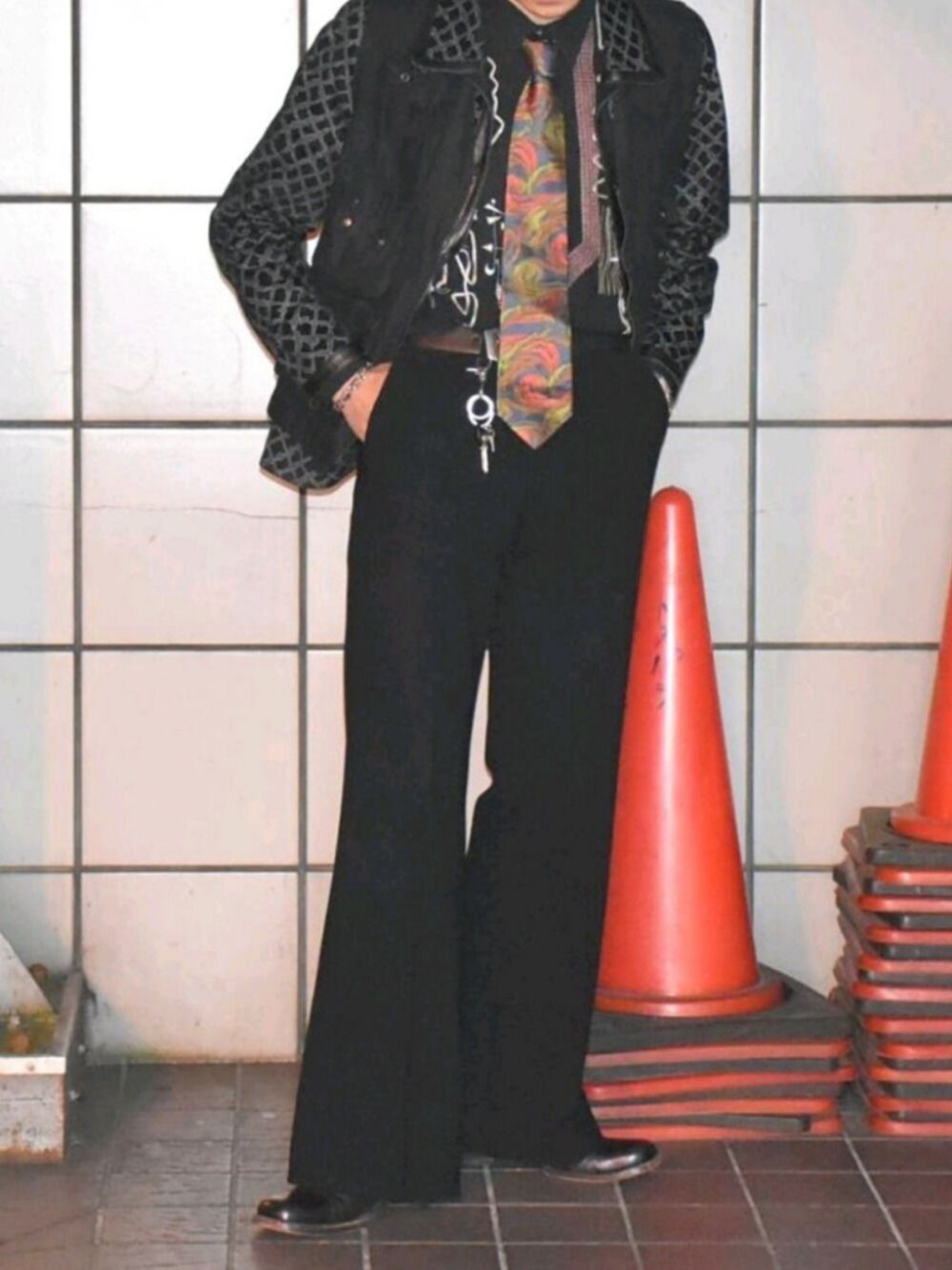 謎 泥酔した時の自分の脳内をネクタイとシャツで表しました、全部古着です 柄シャツ 700円 ネクタイ 100円 総柄レザージャケット 2000円 ミリタリーベスト 2000円 DKNYフレアパンツ 500円 ヒールブーツ 3000円 安いネ