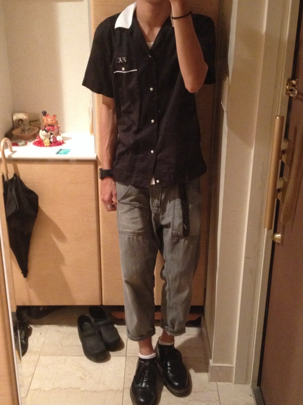 ボーリングシャツ、かっこいいですよね〜 派手なのもいいですが、これはモノトーンの配色が気に入ってます ボーリングシャツ DELUXE タンクトップ UNIQLO ジーンズ World Workers ソックス BEAMS ウィングチップ Dr.Martens × COMME des GARÇONS HOMME DEUX