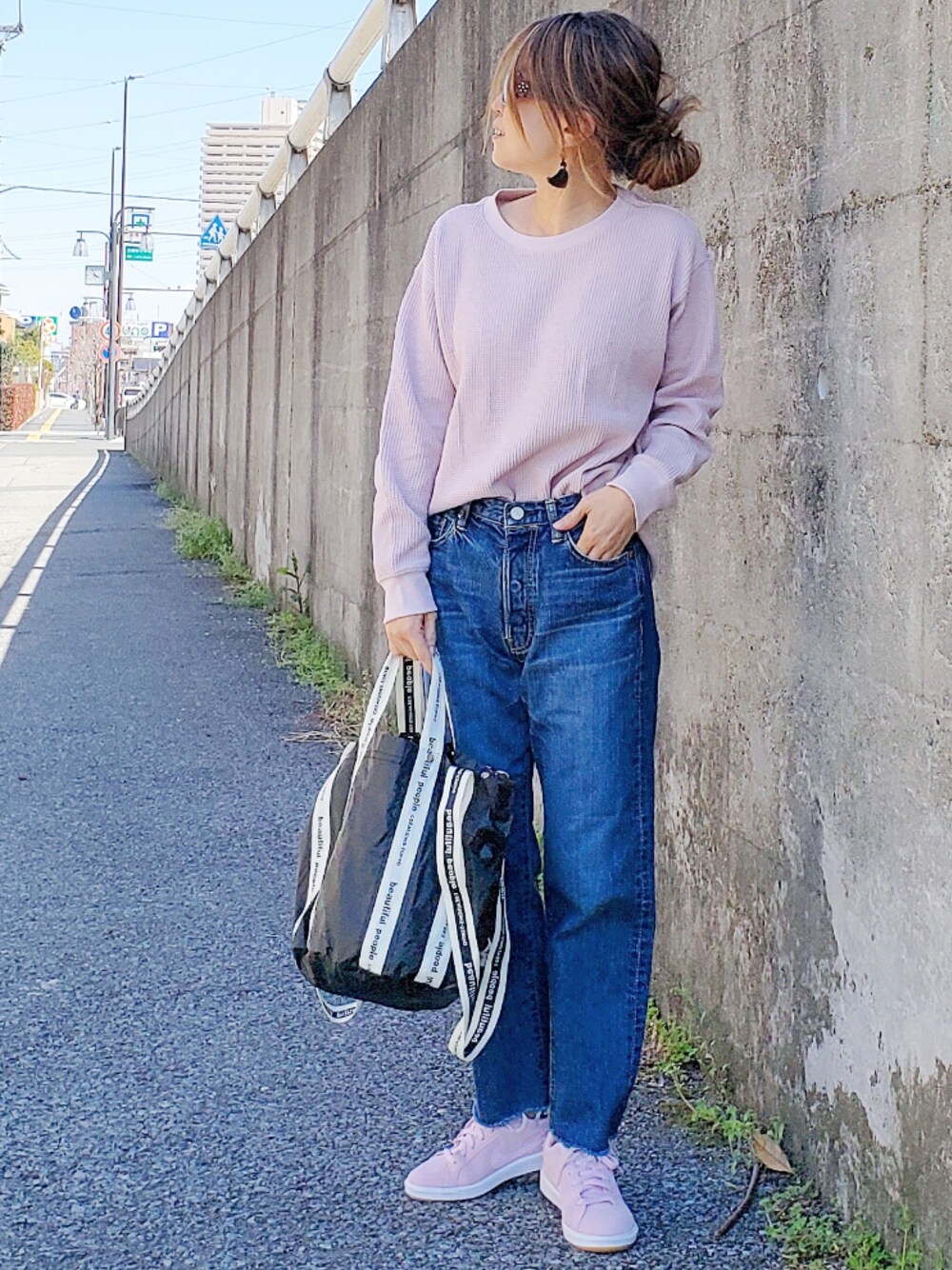 ユニクロのワッフルクルーネックTで 超シンプルコーデ✨ くすみピンクです。
