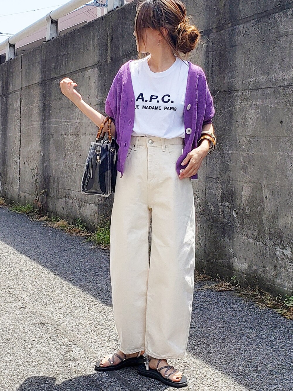 シンプルコーデにパープルのカーディガン💜