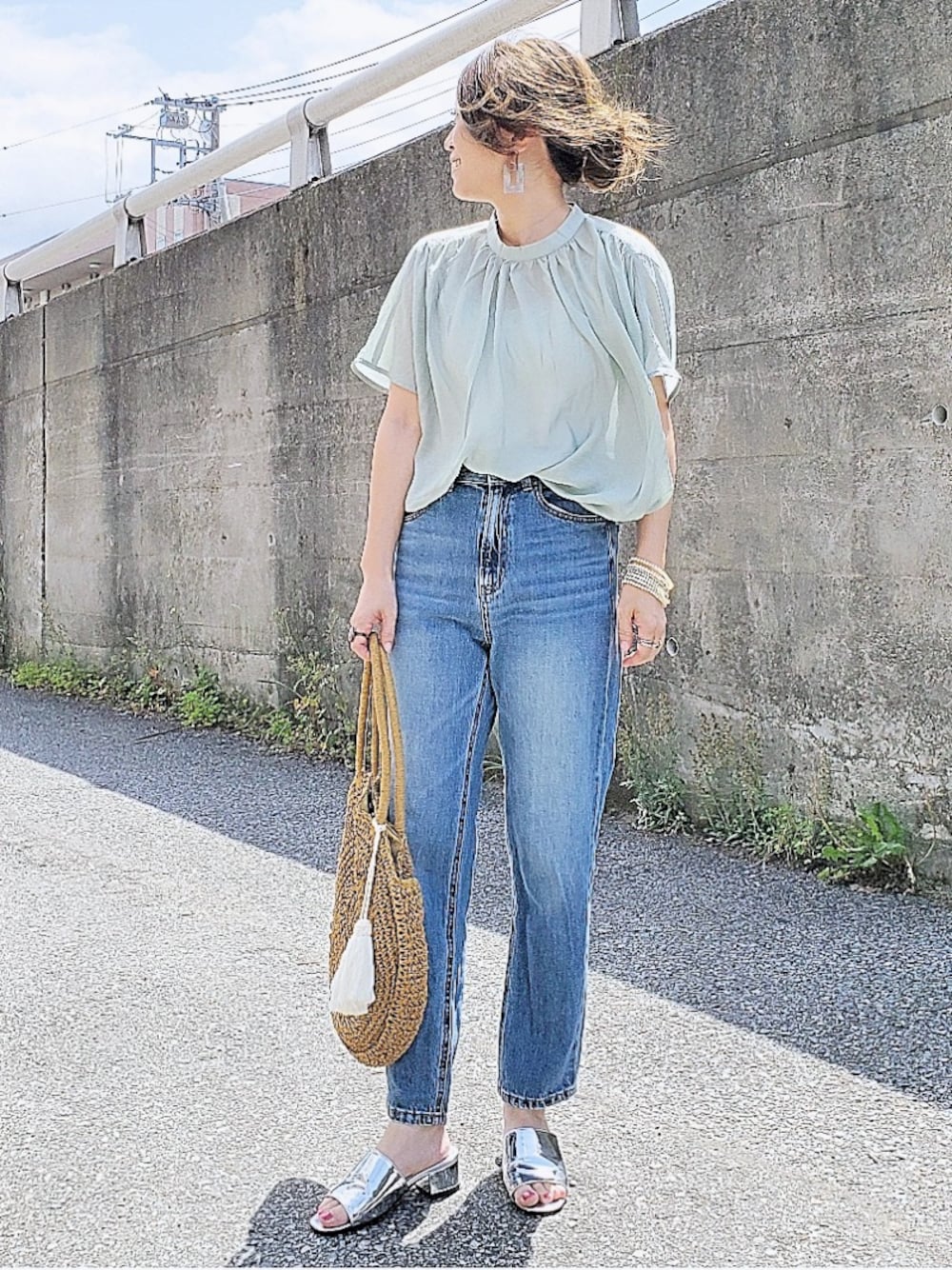 Ambre Neige のギャザーブラウス✨ たっぷりなギャザーでふんわり感が出る💚 シアーな素材なのが今年っぽい🎵 デニムを合わせてカジュアルめにしたけど 少しきちんとした場でも使えそう😉💡 Instagram⏩and_rich_