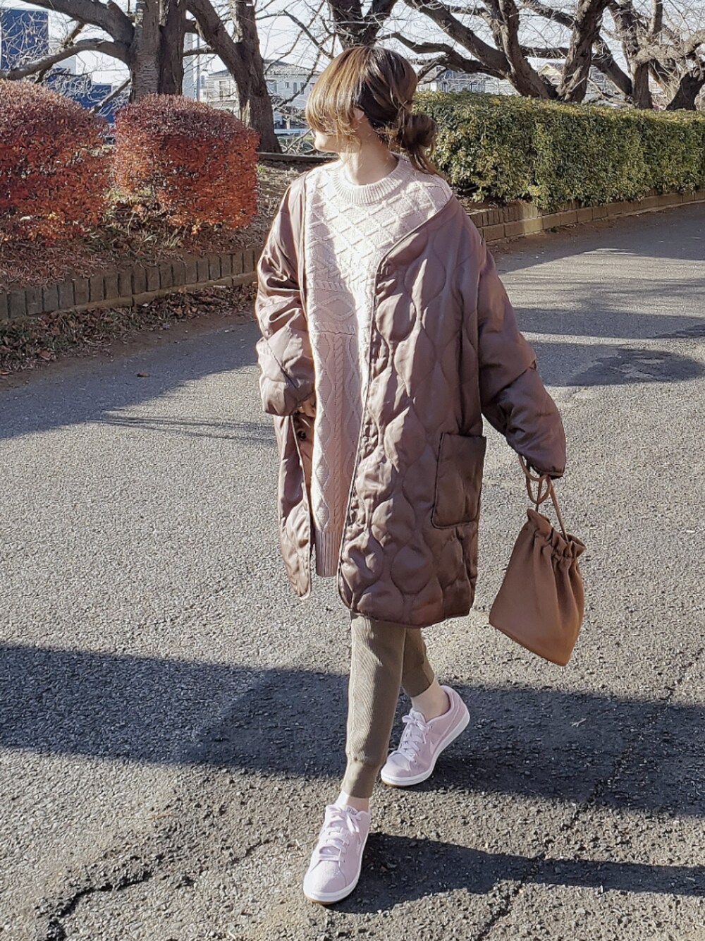 ライナーコートのキルティングジャケットでゆるっと🎵 モカ色と淡いピンクで柔らかめに😊✨ 中はチュニック丈ニットにレギンス。 最近こういう楽チンなのが増えてる😂 Instagram⏩⏩and_rich_