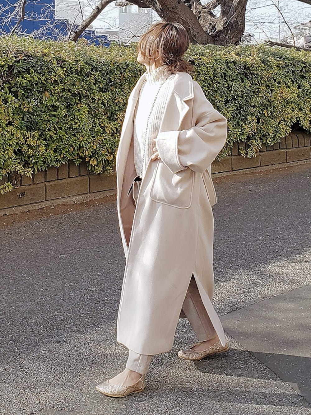 エクリュカラーでワントーン☺️ 《sakishimatokyo》のロングチェスターコート、 これほんと私の求めてた形🙌 ゆったりオーバーサイズシルエットで、 サイドスリット入っていて、 ベルト付きのガウンコートタイプで、 大きめなポケットで、 エクリュカラーのロングコート。 私の好きが詰め込まれてる😘💓 Instagram⏩⏩and_rich_