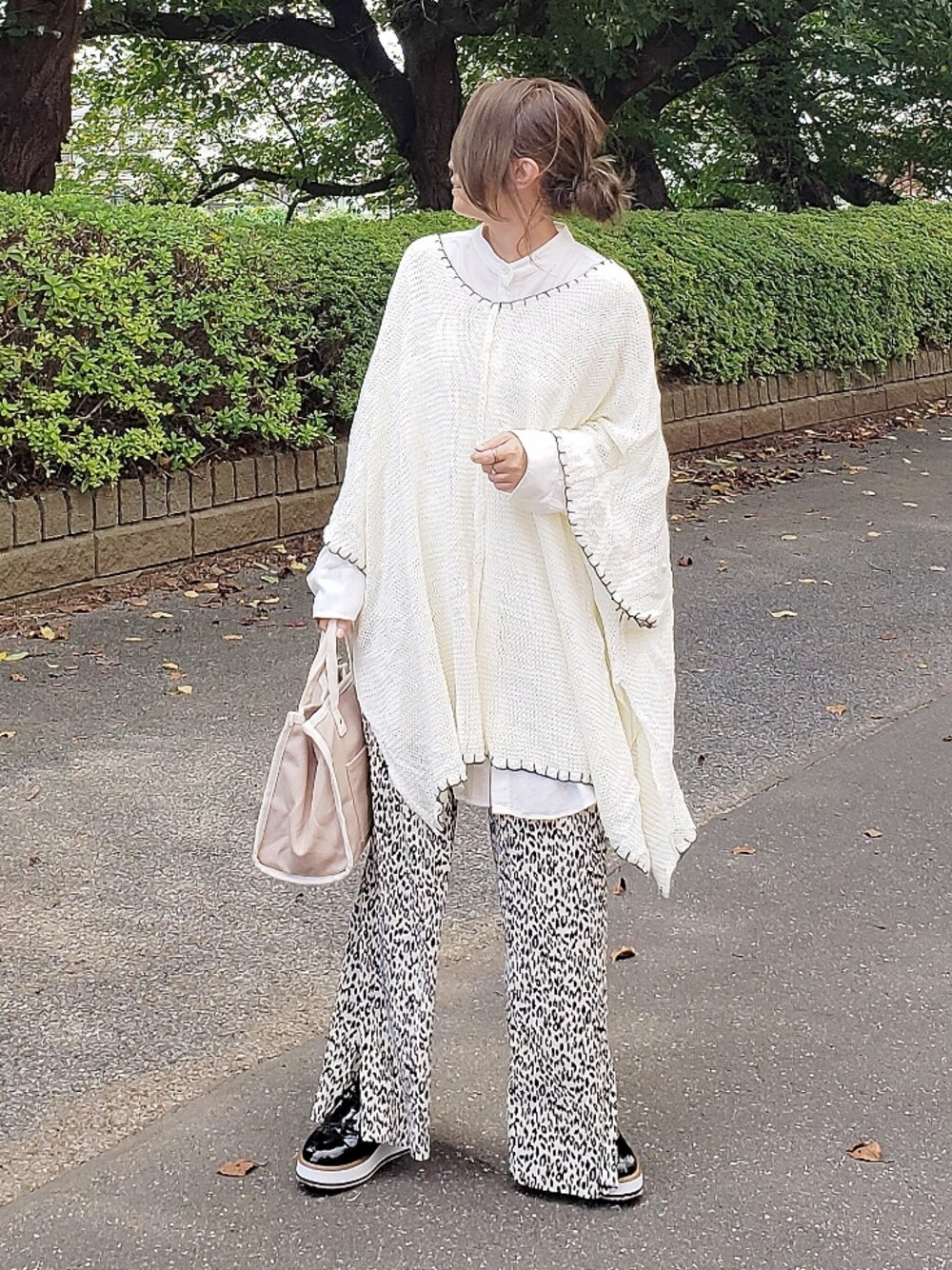 夏前にも着てたステッチ入りポンチョニット。 またちょうど良い時期になってきた🎵 暑いときは中をタンクトップにしていて 今は長袖シャツを合わせたよ✨ 秋っぽくレオパ柄パンツと🐆 Instagram⏩⏩and_rich_
